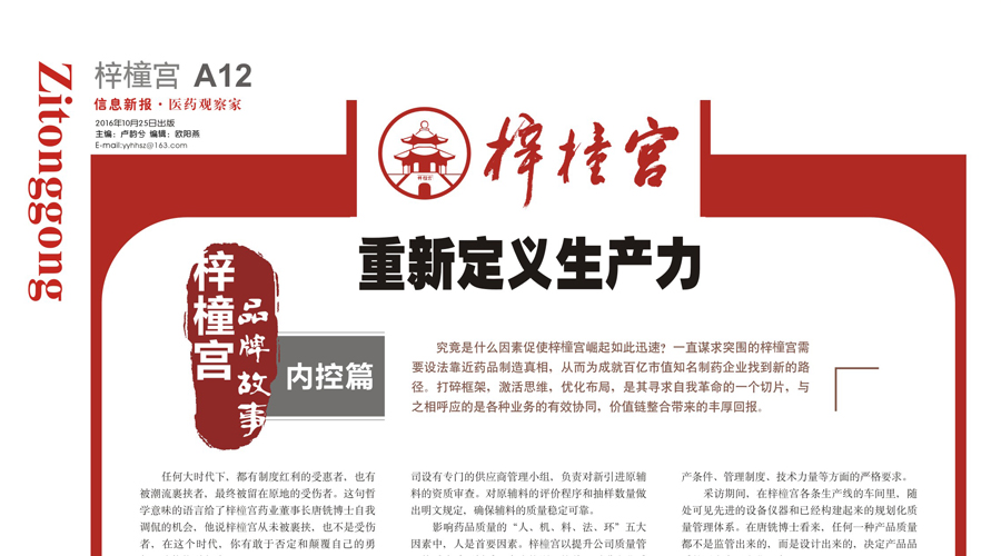 26 16-102016年10月25日,《醫(yī)藥觀察家報》對梓橦宮藥業(yè)品牌故事進行了系列報道。本期報道主題為梓橦宮品牌故事系列之內控篇——《梓橦宮:重新定義生產力》。