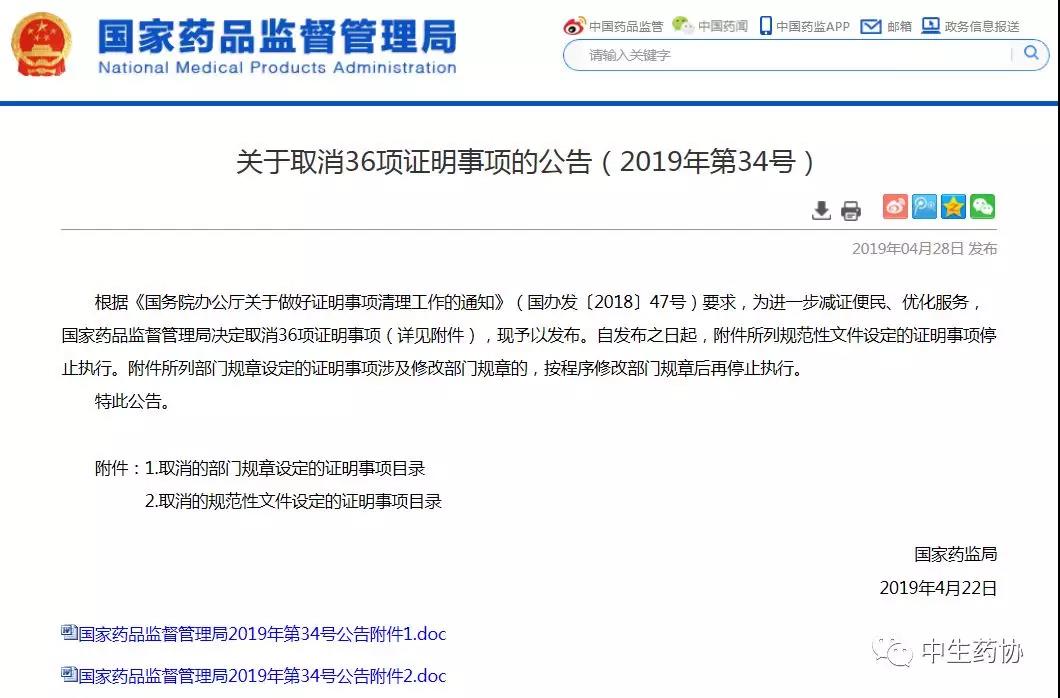 03 19-062019年4月28日國家藥品監(jiān)督管理局頒布關(guān)于取消36項證明事項的公告(2019年第34號) ,以下是發(fā)稿原文。